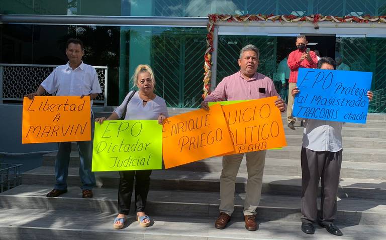 Con pancartas de ‘Libertad a Marvin’, ‘EPO dictador judicial’, ‘Juicio Político para Enrique Priego’ y ‘EPO protege al magistrado Traconis Chacón’, un grupo de personas protestó fuera del Congreso de Tabasco previó al informe anual de labores del Presidente del Tribunal Superior de Justicia (TSJ), Enrique Priego Oropeza.